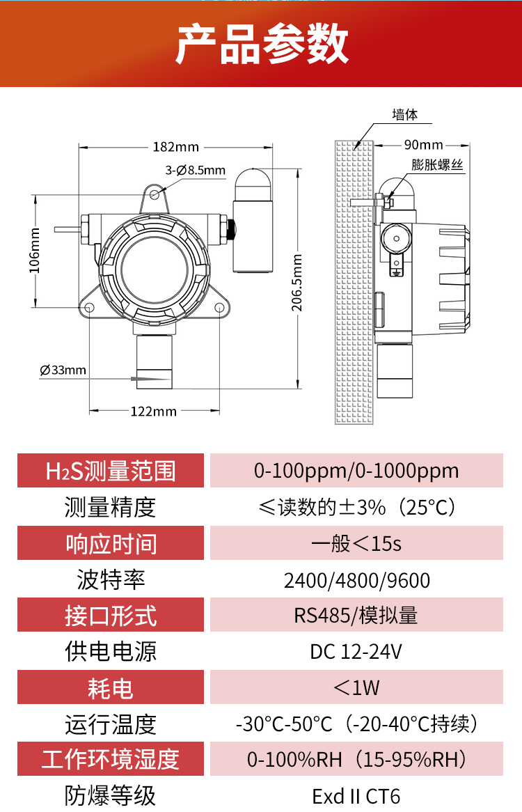 H2S測量精度:≤讀數的土3% (25°C)